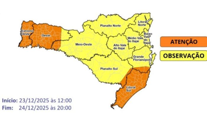 As áreas com maior atenção são o Litoral Sul e o Grande Oeste Catarinense. Durante a noite de quarta-feira, a tendência é de perda de intensidade das instabilidades, com retorno gradual do tempo firme.