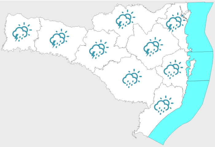 Da Grande Florianópolis ao Sul do Estado, também há chance de chuva, porém com menor intensidade no início e fim do dia, e risco baixo para ocorrências. As temperaturas máximas à tarde variam entre 26°C e 28°C no Oeste e Litoral Sul, e entre 23°C e 26°C nas demais regiões. O vento predomina de nordeste, com intensidade fraca a moderada e rajadas mais fortes nas áreas de maior altitude.