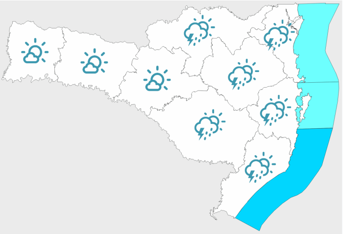 O tempo volta a mudar na quinta-feira (06) com o avanço de uma nova frente fria, que provoca chuva e temporais nas áreas de divisa com o Rio Grande do Sul. Risco baixo a moderado para alagamentos, destelhamentos e queda de galhos e árvores. As mínimas chegam a 5°C na Serra e variam entre 12°C e 16°C nas demais regiões. À tarde, as temperaturas sobem e alcançam 30°C no Grande Oeste. Os ventos sopram mais intensos no Litoral, entre 40 e 50 km/h, com rajadas de até 70 km/h, predominantemente de sul. O mar segue agitado, com ondas de 2,0 a 2,5 metros e condições favoráveis para alagamentos costeiros.