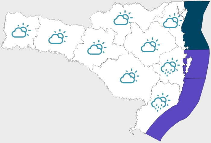 Com a chegada de uma área de alta pressão, o tempo volta a ficar estável em grande parte do estado. O sol aparece no Oeste, enquanto o litoral segue com maior nebulosidade por causa dos ventos de leste. Não há risco para ocorrências meteorológicas. As temperaturas caem, com mínimas entre 8°C e 11°C e máximas que variam de 20°C a 25°C. A agitação marítima perde força, mas ainda há risco moderado para o litoral, com ondas de até 3 metros na Grande Florianópolis.