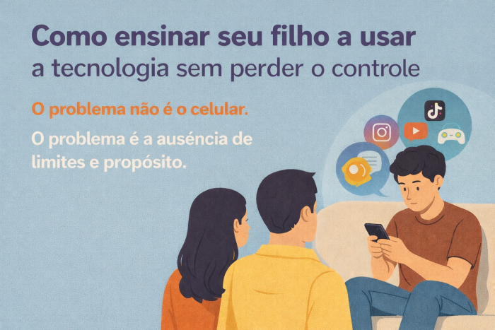 O problema não é o celular, é a ausência de limites e propósito. Veja como orientar seu filho para usar a tecnologia com equilíbrio e consciência.