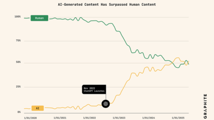 Foto: Reprodução Nos últimos anos, a presença da inteligência artificial (IA) na produção de textos online cresceu de forma acelerada. Uma análise de publicações entre 2022 e 2025 indica que, em maio, artigos escritos por modelos de linguagem chegaram a 51% do total, superando os criados por pessoas (48,28%). Embora o recorte citado tenha considerado 65 URLs, o dado ilustra uma tendência clara: a IA deixou de ser coadjuvante e passou a ocupar papel central na geração de conteúdo.