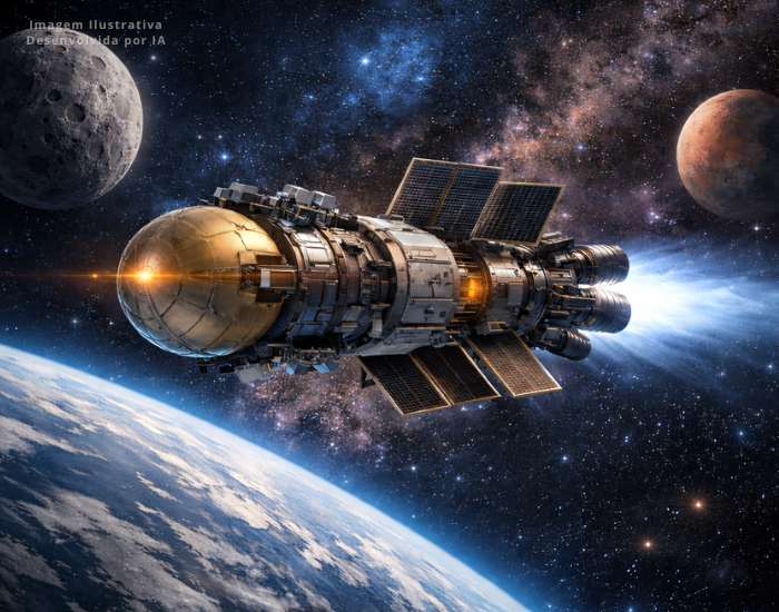 A transição para a Propulsão Nuclear Elétrica (NEP) promete cem vezes mais potência que as missões Voyager, garantindo a sobrevivência humana no vácuo profundo e o fim da dependência crítica da radiação solar.