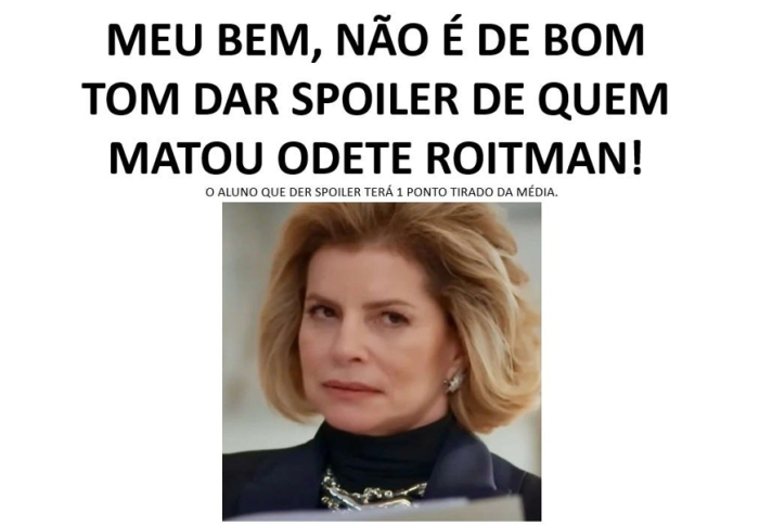 Combinamos que, a partir do início da novela, não olharíamos o WhatsApp nem qualquer rede social. Ela, tirando sarro, fez uma imagem imitando a fala da Odete: “Meu bem, não é de bom tom dar spoiler de quem matou Odete Roitman”, seguida de letras miúdas: “O aluno que falar perderá um ponto da média”. Claro, por pura brincadeira, mas fizemos para eu colar atrás do meu jaleco.