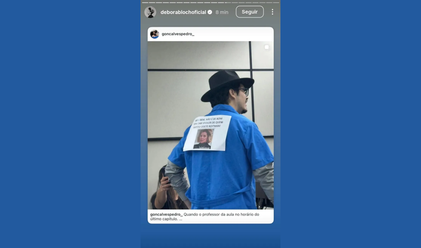 Ao chegar à escola, pedi ajuda para a Duda, do Comercial, para colocar a imagem nas minhas costas. Entrei na sala arrancando risadas dos alunos e comentários sobre o final da novela. Antes mesmo de eu pedir, uma das alunas já havia tirado uma foto e nos encaminhado. Aproveitando a onda, publiquei no Instagram com a legenda: “Quando o professor da aula no horário do último capítulo”, marcando alguns atores do elenco, em especial a talentosa Debora Bloch, que deu vida à icônica vilã em 2025.