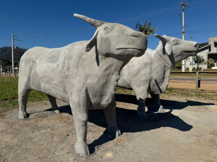 O carro de boi estilizado, tracionado por uma junta de bois moldados em arame e cimento, está prestes a se transformar em uma das atrações turísticas de Pedras Grandes.