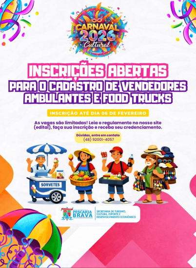 Foto: Divulgação A Prefeitura de Pescaria Brava abriu o período de inscrições para comerciantes interessados em atuar durante o Carnaval Cultural de Pescaria Brava 2026. O chamamento público é coordenado pela Secretaria de Turismo, Cultura, Esporte e Desenvolvimento Econômico.