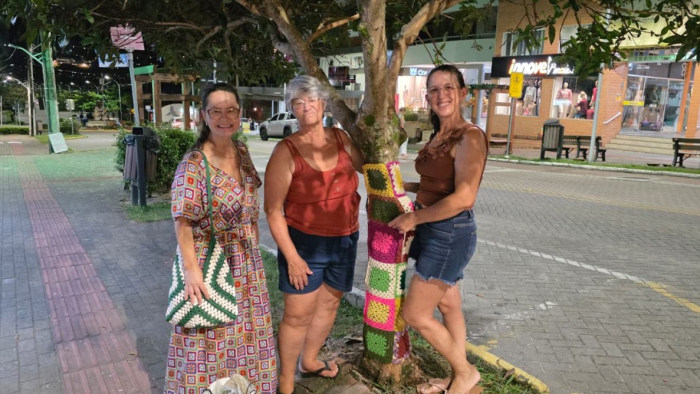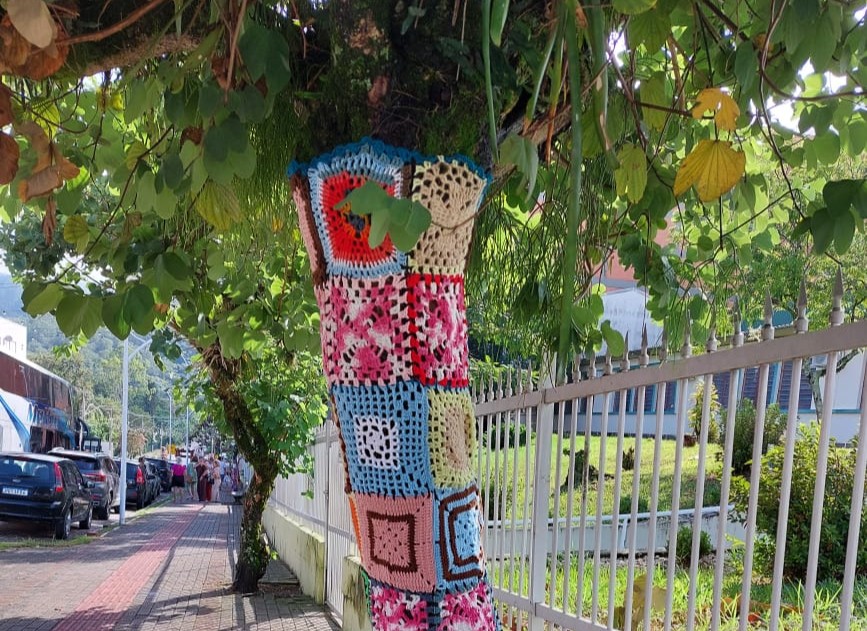 Foto: DECOM/PMG O projeto Crochê nas Árvores começou a ganhar forma em Gravatal e já chama a atenção de moradores e turistas na região das Termas. Após dois dias de atividades na última semana, o grupo retomou os trabalhos nesta terça-feira (31), dando continuidade ao revestimento dos troncos com peças confeccionadas por integrantes dos Grupos de Mulheres coordenados pela Secretaria de Assistência Social.