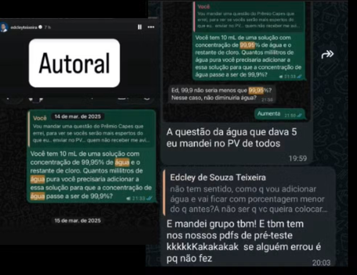 Segundo mensagens enviadas por Edcley ao grupo de monitoria que reunia centenas de alunos, ele havia indicado previamente a resposta de uma questão de probabilidade relacionada ao lançamento de dados, cuja solução correta foi confirmada pelo gabarito oficial. O mesmo ocorreu com o item que tratava da diluição de uma solução, resolvido pela alternativa “5”, também válida na correção divulgada pelo instituto.
