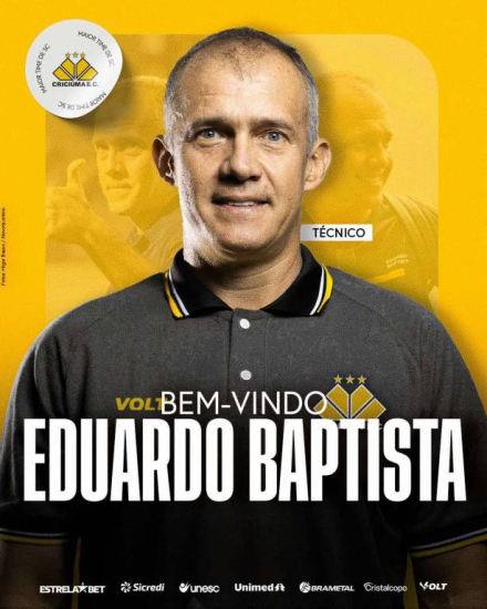 Foto: Criciúma O Criciúma confirmou nesta quarta-feira (7) o seu novo comandante para a temporada. Eduardo Baptista chega ao Tigre para comandar a equipe a partir da 7ª rodada da Série B do Campeonato Brasileiro e terceira fase da Copa do Brasil.