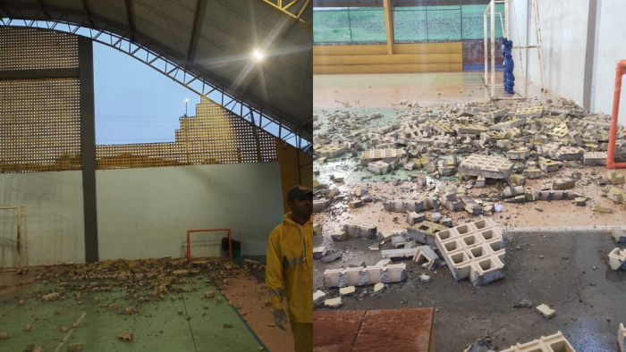 Foto: Divulgação Parte do muro do ginásio de uma escola em Mondaí, no Oeste de Santa Catarina, desabou durante um vendaval na tarde desta sexta-feira (9). Com a queda da estrutura, seis crianças tiveram ferimentos leves e foram levadas ao hospital.