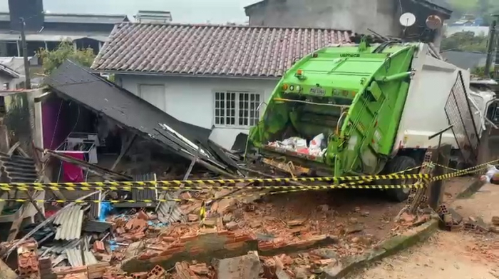 Foto: Reprodução Um caminhão de coleta de lixo invadiu uma residência na tarde desta quinta-feira (30), no bairro São Martinho, em Tubarão, após o motorista perder o controle da direção. Apesar da destruição causada pelo impacto, ninguém ficou ferido, segundo informações preliminares.
