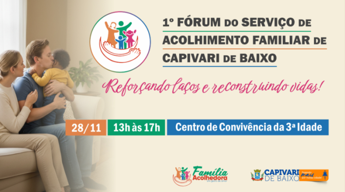 Foto: Reprodução Com o tema “Reforçando Laços e Reconstruindo Vidas”, Capivari de Baixo realiza nesta sexta-feira (28) o 1º Fórum do Serviço de Acolhimento Familiar, iniciativa que reúne gestores, especialistas e a comunidade para discutir o fortalecimento da política pública conhecida como Família Acolhedora.