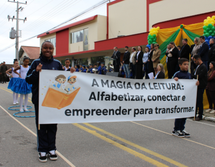 Foto: Daiane Fernandes O tradicional Desfile Cívico em comemoração à Independência do Brasil reuniu dezenas de pessoas em frente ao Salão Paroquial, no Centro de Gravatal, no último sábado. Neste ano, o evento trouxe como tema “A Magia da Leitura - Alfabetizar, Conectar e Empreender para Transformar!”, destacando a leitura como ferramenta essencial para o conhecimento, a transformação social e o desenvolvimento de habilidades empreendedoras.