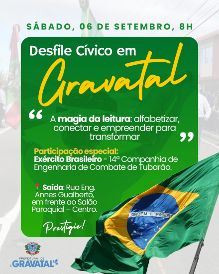 Imagem: Divulgação/Prefeitura de Gravatal A cidade de Gravatal se prepara para celebrar a Independência do Brasil com um Desfile Cívico neste sábado, 6 de setembro, a partir das 8h. O evento, com o tema "A magia da leitura: alfabetizar, conectar e empreender para transformar", promete reunir a comunidade para um momento de civismo e reflexão sobre a educação.