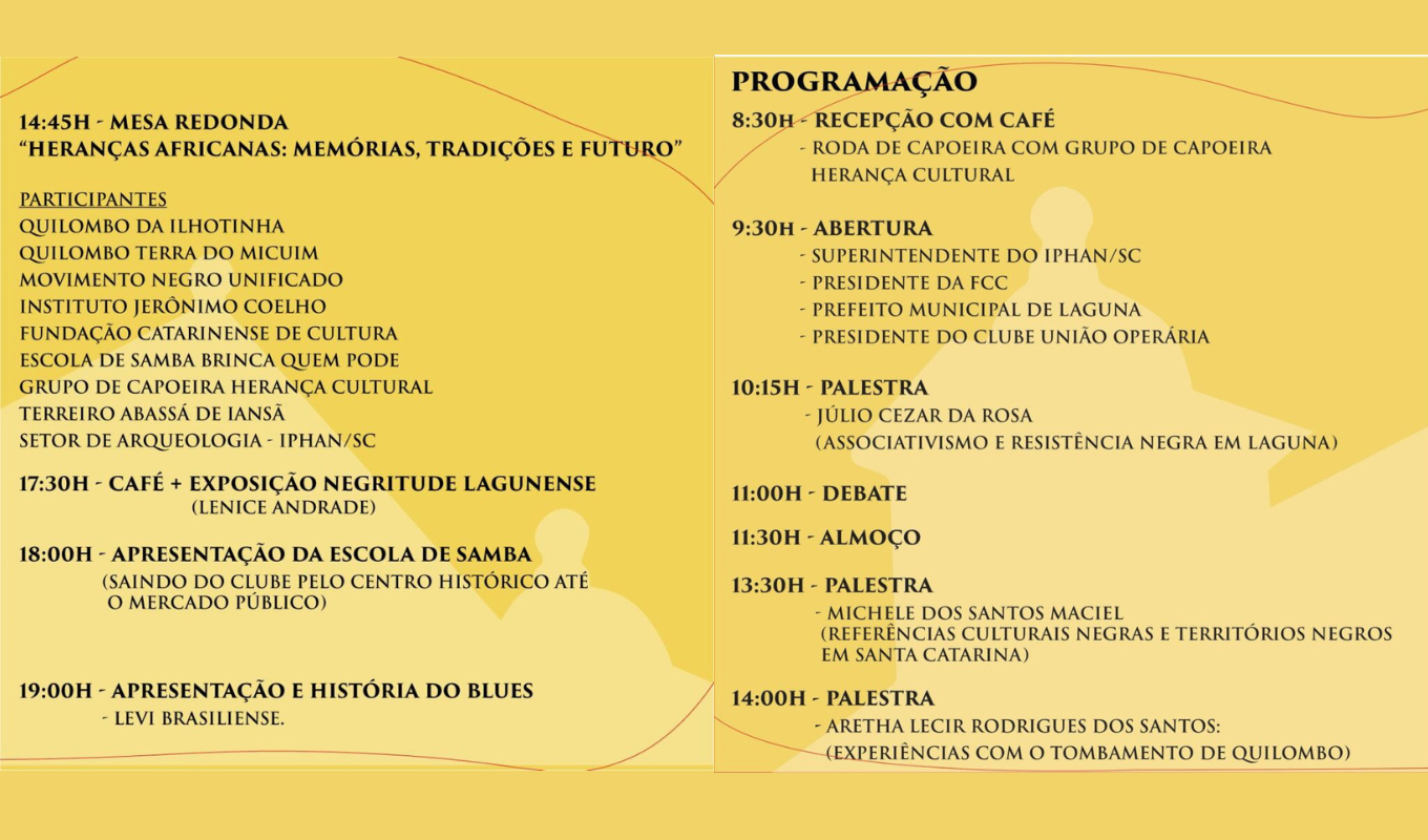 Foto: Reprodução O Instituto do Patrimônio Histórico e Artístico Nacional (IPHAN) promove, no dia 27 de novembro, o evento “Para além dos 40 anos de tombamento: referências culturais negras em Laguna”, em alusão à Semana da Consciência Negra. O encontro será realizado na Sociedade Recreativa União Operária, um dos espaços históricos mais significativos do município.