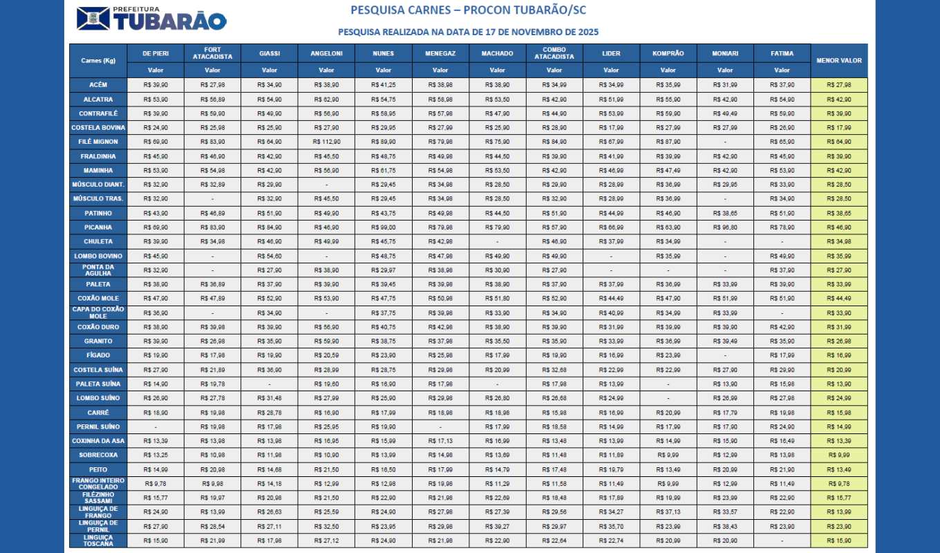 Foto: Reprodução O Procon de Tubarão divulgou a pesquisa comparativa de preços das carnes referente a novembro de 2025, realizada nos principais supermercados do município. O levantamento mostra variações expressivas entre os estabelecimentos, principalmente nos cortes bovinos, reforçando a importância da pesquisa antes da compra.