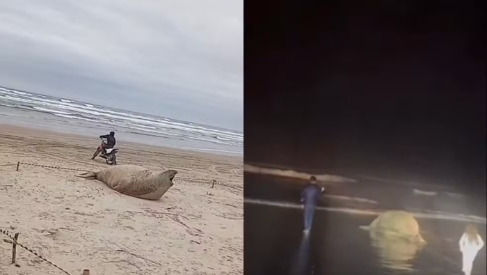 Imagens mostram o mamífero sendo importunado com luzes de faróis de carro, barulho e correria de pessoas. O animal, que descansava na areia, voltou ao mar antes do tempo necessário para recuperação. Segundo especialistas, ele já havia sido perturbado por um motociclista que passou próximo.