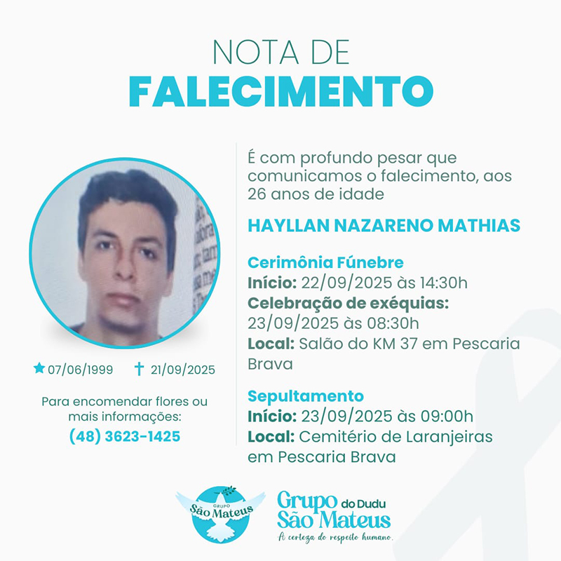 É com profundo pesar que comunicamos o falecimento de Ayllan Nazareno Mathias, de 26 anos, nesta segunda-feira (22). A informação foi divulgada pelo Grupo São Mateus de Capivari de Baixo.