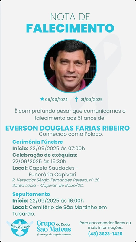 É com profundo pesar que comunicamos o falecimento de Everson Douglas Farias Ribeiro, de 51 anos, nesta segunda-feira (22). A informação foi divulgada pelo Grupo São Mateus de Capivari de Baixo.