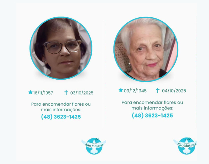 Foto: Reprodução O Grupo São Mateus comunica, com profundo pesar, o falecimento de Valdete de Medeiros Fermino, aos 67 anos, e de Maria Neive dos Santos Bitencourt, aos 79 anos.