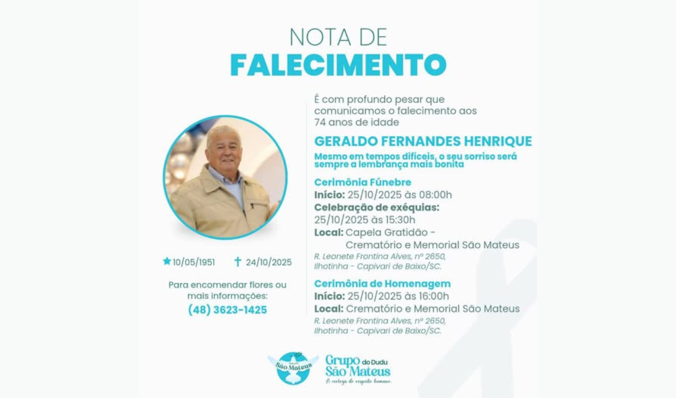 A cerimônia fúnebre ocorre neste sábado, 25 de outubro, com início às 8h, na Capela Gratidão – Crematório e Memorial São Mateus, localizada na Rua Leonete Frontina Alves, nº 2650, em Ilhotina, Capivari de Baixo. A celebração das exéquias está marcada para as 15h30, seguida da cerimônia de homenagem às 16h, no mesmo local.