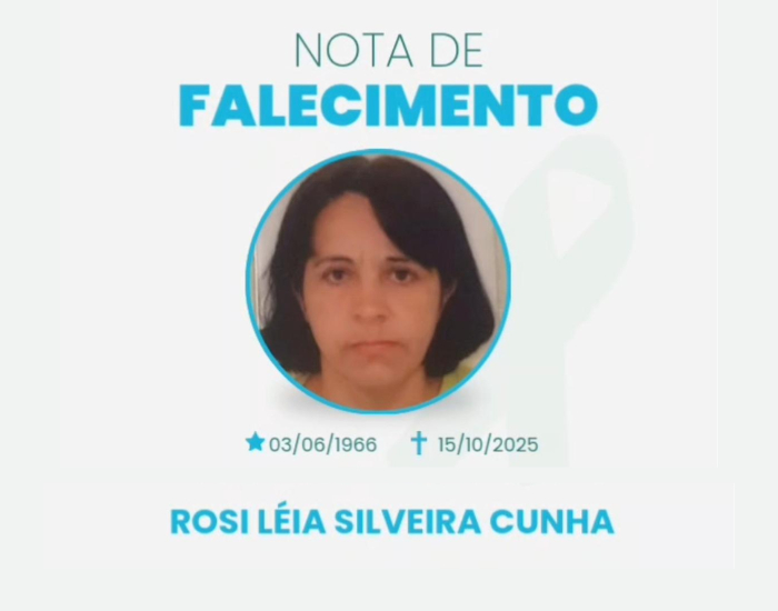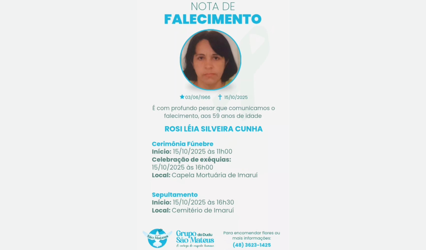 Foto: Reprodução Com pesar, a comunidade de Imaruí (SC) recebeu nesta quarta-feira, 15 de outubro de 2025, a notícia do falecimento de Rosi Léia Silveira Cunha, aos 59 anos de idade.
