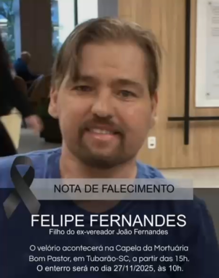 Foto: Reprodução A comunidade de Tubarão recebeu com pesar, nesta quarta-feira (26), a notícia do falecimento de Felipe Fernandes, filho do ex-vereador João Fernandes e de Marlete Theodoro Fernandes. A informação foi confirmada por familiares.