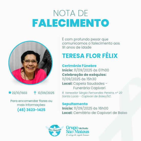 É com profundo pesar que comunicamos o falecimento de Teresa Flor Félix, de 91 anos, nesta quinta-feira (11). A informação foi divulgada pelo Grupo São Mateus de Capivari de Baixo.