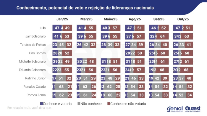 Nas simulações de primeiro turno, Lula aparece entre 35% e 43% das intenções de voto. O ex-presidente Jair Bolsonaro (PL), atualmente inelegível e condenado pelo Supremo Tribunal Federal (STF) a 27 anos e três meses de prisão por tentativa de golpe, ainda figura como principal nome da oposição, com 26%.