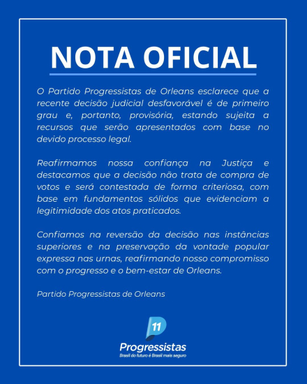 Foto: Divulgação O Partido Progressistas de Orleans divulgou uma nota oficial após a repercussão, nas redes sociais, de uma decisão judicial desfavorável à sigla. No comunicado, o partido esclarece que a sentença é de primeiro grau e, portanto, não possui efeito definitivo, estando sujeita a recursos nas instâncias superiores.