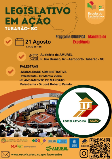 Imagem: Divulgação Tubarão sediará, no dia 21 de agosto, o seminário Legislativo em Ação – Qualifica Mandato de Excelência, uma iniciativa da Assembleia Legislativa de Santa Catarina (Alesc) por meio da Escola do Legislativo Deputado Lício Mauro da Silveira. O evento acontece das 13h30 às 18h, no auditório da Associação dos Municípios da Região de Laguna (Amurel).
