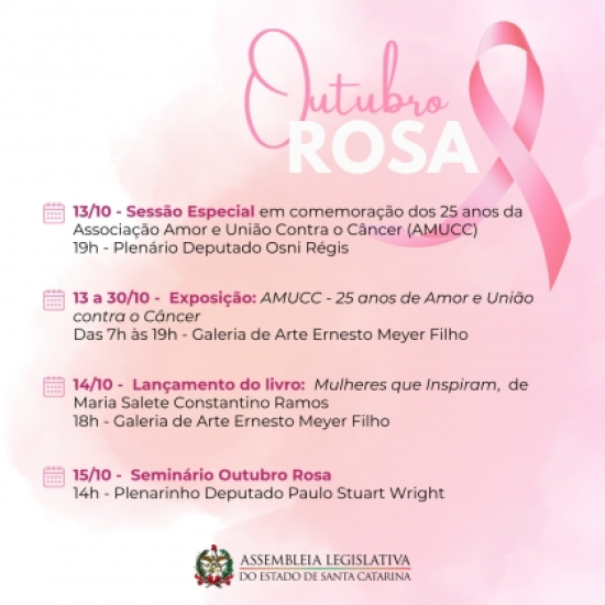 O mês de outubro marca o Outubro Rosa, campanha mundial que reforça a importância da prevenção e do diagnóstico precoce do câncer de mama. Para lembrar a data, a Assembleia Legislativa de Santa Catarina (Alesc) organiza diversas ações ao longo do mês, incluindo seminário, exposição e sessão especial.