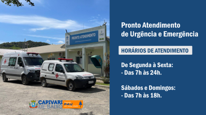 Imagem divulgada no site da prefeitura de Capivari de Baixo A partir do próximo sábado (15), os moradores de Capivari de Baixo terão um novo horário de funcionamento no Pronto Atendimento de Urgência e Emergência (PA) do município. A unidade passará a atender das 7h às 18h aos sábados e domingos, ampliando em três horas diárias o atual horário, que é das 8h às 16h.
