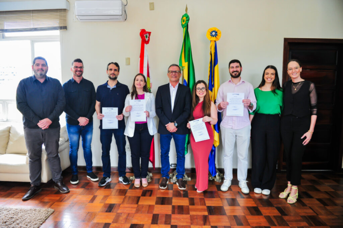 Após a leitura do juramento, o prefeito Claudir Bitencourt assinou os termos de posse e deu as boas-vindas aos novos servidores. Ele destacou a importância do comprometimento de cada profissional para garantir um atendimento de qualidade à população.
