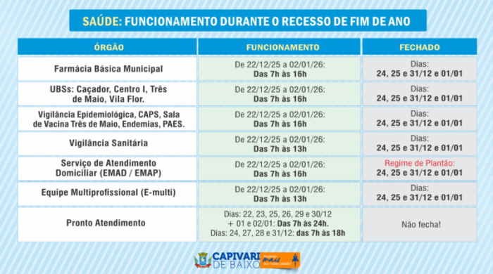 A Sala de Vacinação do Três de Maio, a Vigilância Epidemiológica, o Centro de Atenção Psicossocial (Caps), o setor de Endemias e o Programa PAES também atuarão das 7h às 16h, com suspensão dos atendimentos nos dias 24, 25 e 31 de dezembro e 1º de janeiro. A Vigilância Sanitária terá expediente das 7h às 13h, seguindo o mesmo calendário de fechamento.
