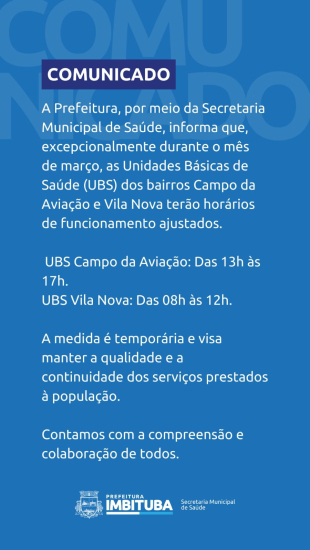 A Prefeitura de Imbituba, por meio da Secretaria Municipal de Saúde, informou que as Unidades Básicas de Saúde (UBS) dos bairros Campo da Aviação e Vila Nova terão horários de funcionamento alterados durante o mês de março.