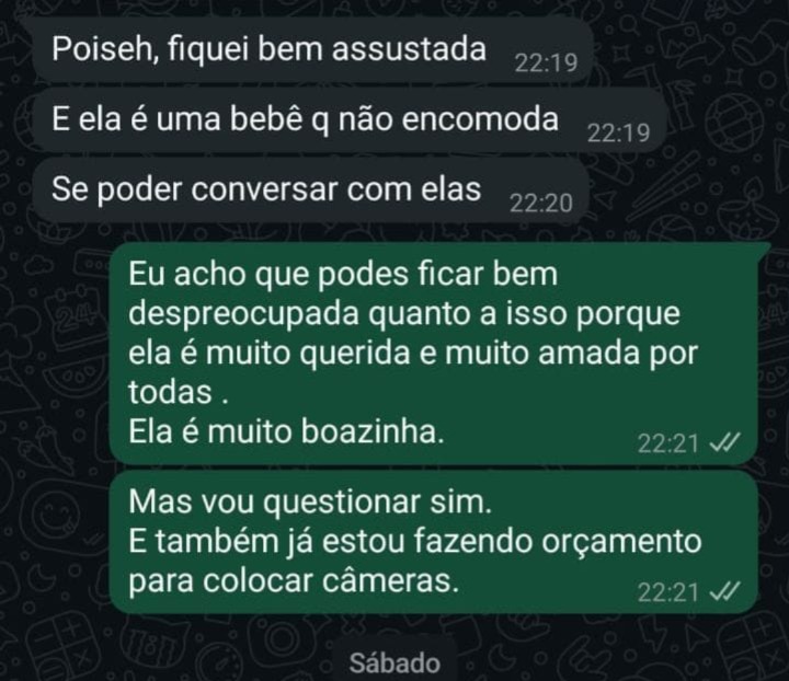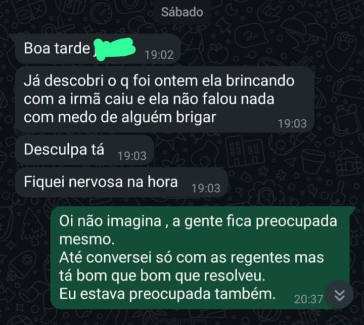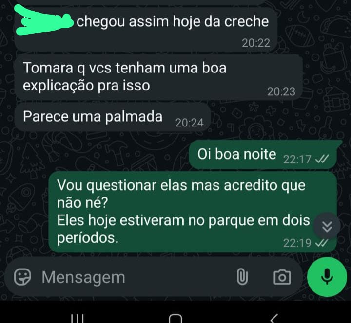 No entanto, os prints vazados dão conta de que a mãe teria entrado em contato com a diretora, questionando as marcas de lesão na filha. A diretora afirmou que iria averiguar o caso com as professoras. No dia seguinte, a mãe relatou que a lesão da menina foi devido à uma brincadeira com a irmã, o que contradiz a versão denunciada nas redes sociais.