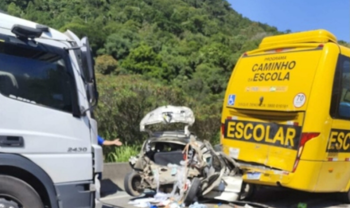 De acordo com a Polícia Rodoviária Federal, a colisão envolveu dois automóveis, um micro-ônibus escolar e uma carreta. Um dos carros ficou completamente destruído com o impacto, deixando ocupantes presos às ferragens.