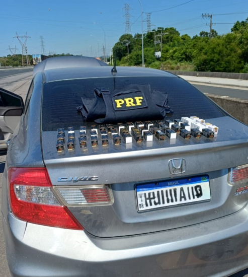 Os produtos estavam escondidos para tentar enganar a fiscalização. A maior parte do carregamento estava inserida dentro da caixa de uma garrafa térmica, lacrada com fitas adesivas. Outras unidades foram localizadas dentro de embalagens de produtos diversos, também lacradas com fita adesiva.